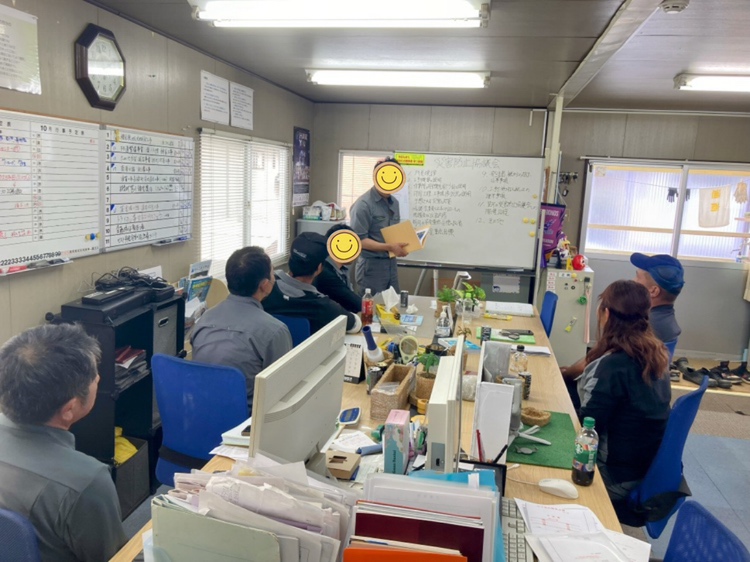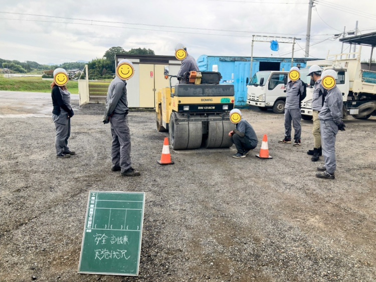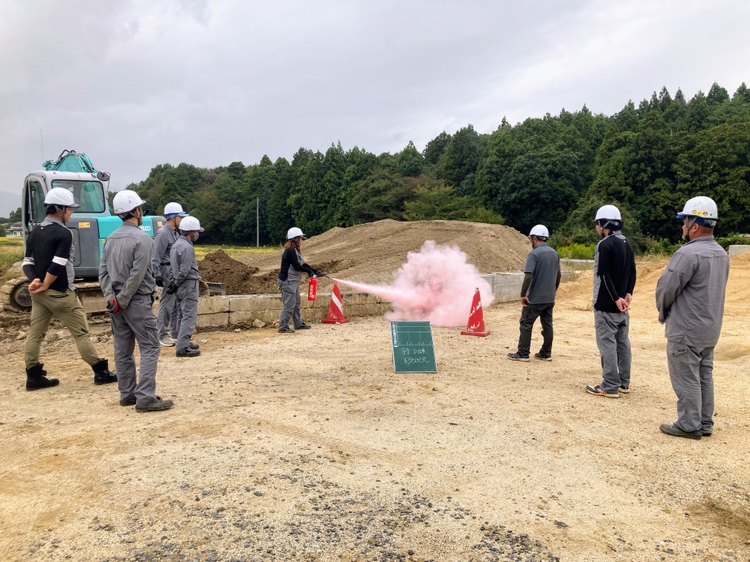 まずは事務所で、安全に関するお話と、工事工程や手順等打合せをし、その後、重機車両の死角を確認したり、実際に消火器を使用して消防訓練も行いました。